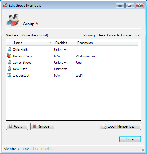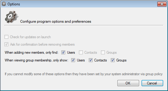 The free edition is intended to be used by smaller organisations where users only manage a single group, or by anyone that wants to test the application out before purchasing the standard edition. It is only able to manage a single group (if the user is a manager of more than one group then a warning will appear and they will only see the first group found) and the user is also not able to change any of the program options (manually or via Group Policy) or add new members from other domains.